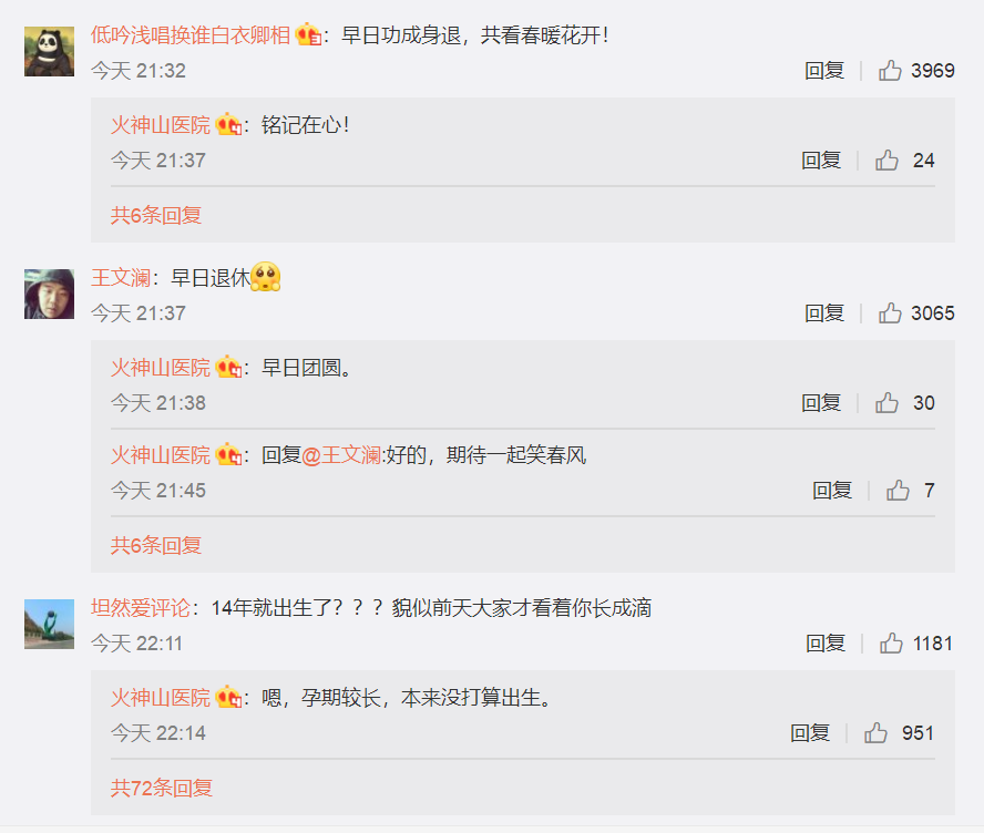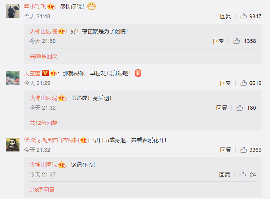 对于网友的“劝退”、“闭院”建议,“小火”的回复也很皮:存在就是为了闭院!功必成!身后退!