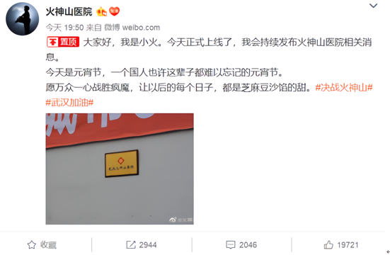此外,火神山医院的官方微博粉丝数也在不断增加,截至发稿,该账号已经有2万多粉丝,且呈快速增长势头。