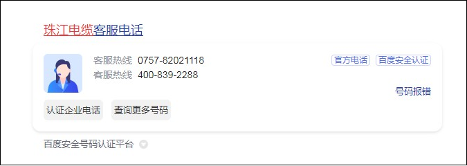 2.在百度搜索的同时,会出现品牌服务电话,有这个标志,也是有一定品牌价值地位的,最起码是通过了一些认证,可以让人信任去打电话联系。